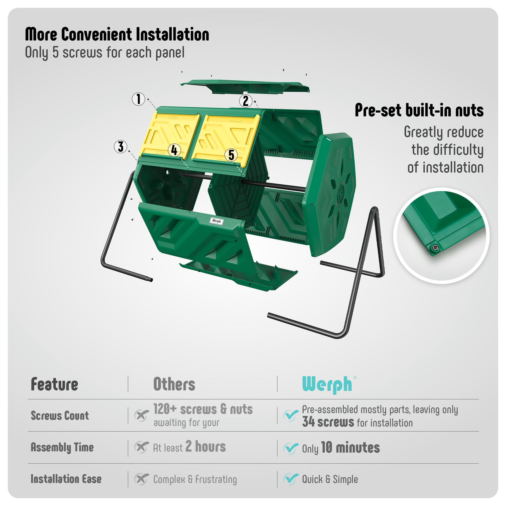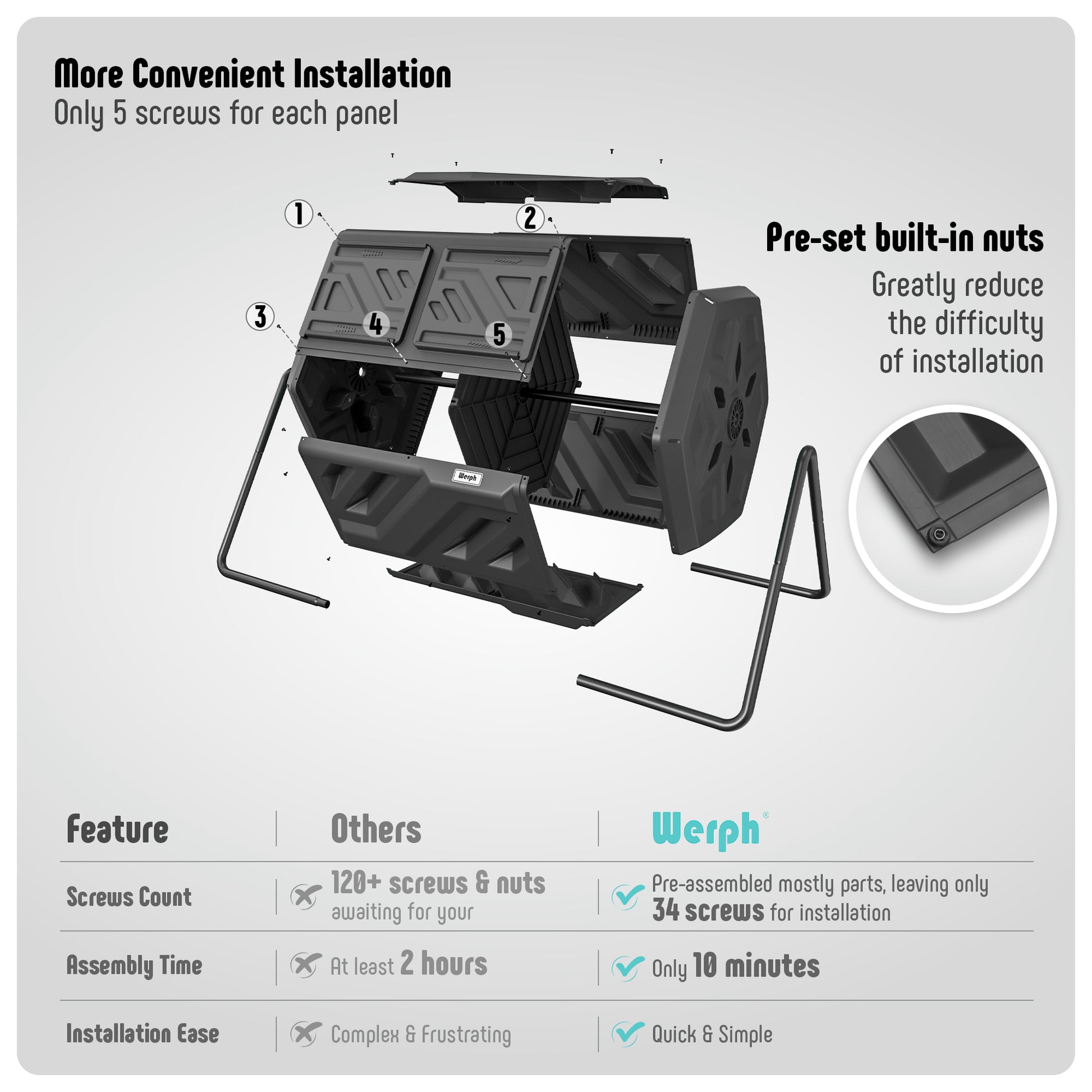 - Quick and Easy Assembly: Unlike other composters that require over 120 screws, our design only needs 34 screws for installation, reducing setup time from 2 hours to just 10 minutes. Most parts come pre-assembled, making it quick and simple to start composting