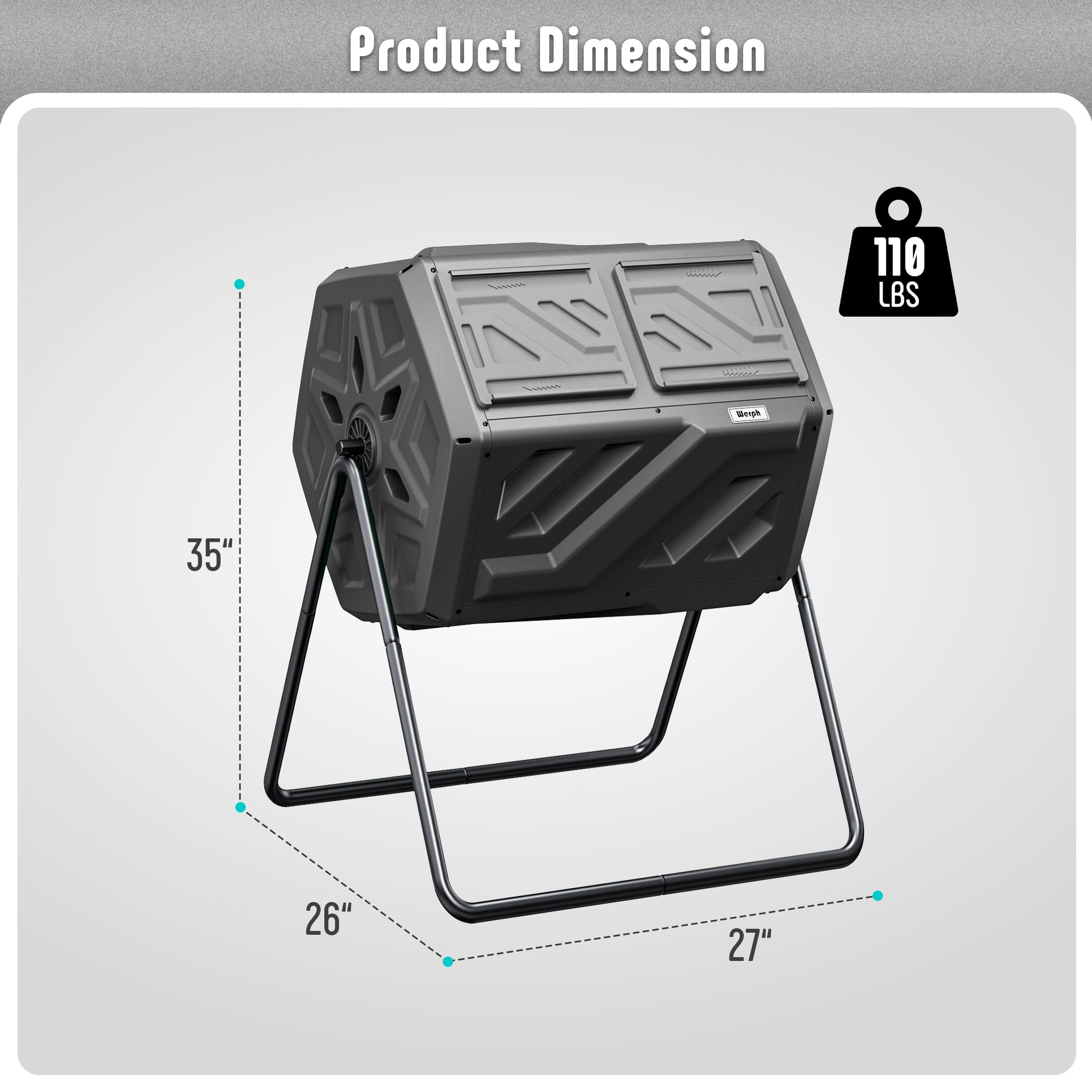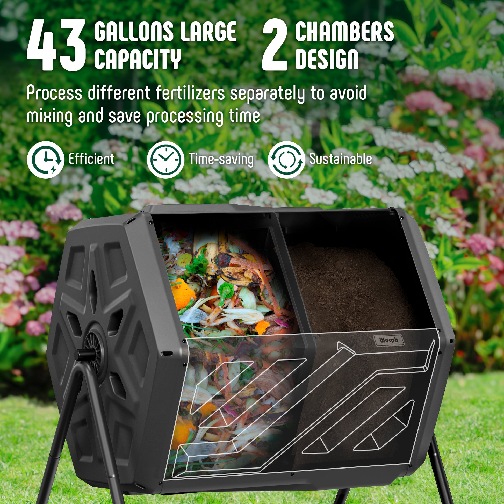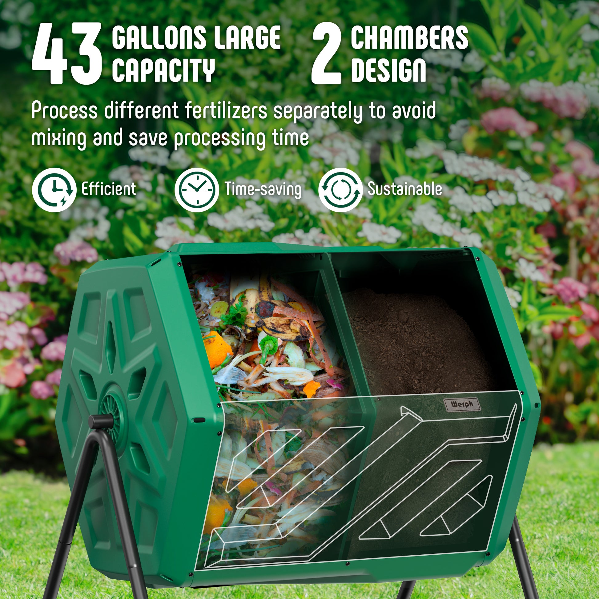 Werph 43 Gallon tumbling composter with dual rotating batch compost bin offers a fast, efficient, and convenient way to create nutrient-rich compost. With a large 43-gallon capacity and dual chamber design, it allows separate processing of different materials for quicker results. The 360-degree tumbling mechanism ensures even mixing without the need for hand stirring. Made from durable, BPA-free, all-weather materials, it's designed to last. Composting garden waste and kitchen scraps takes just 4-6 weeks, with easy access via a sliding door.