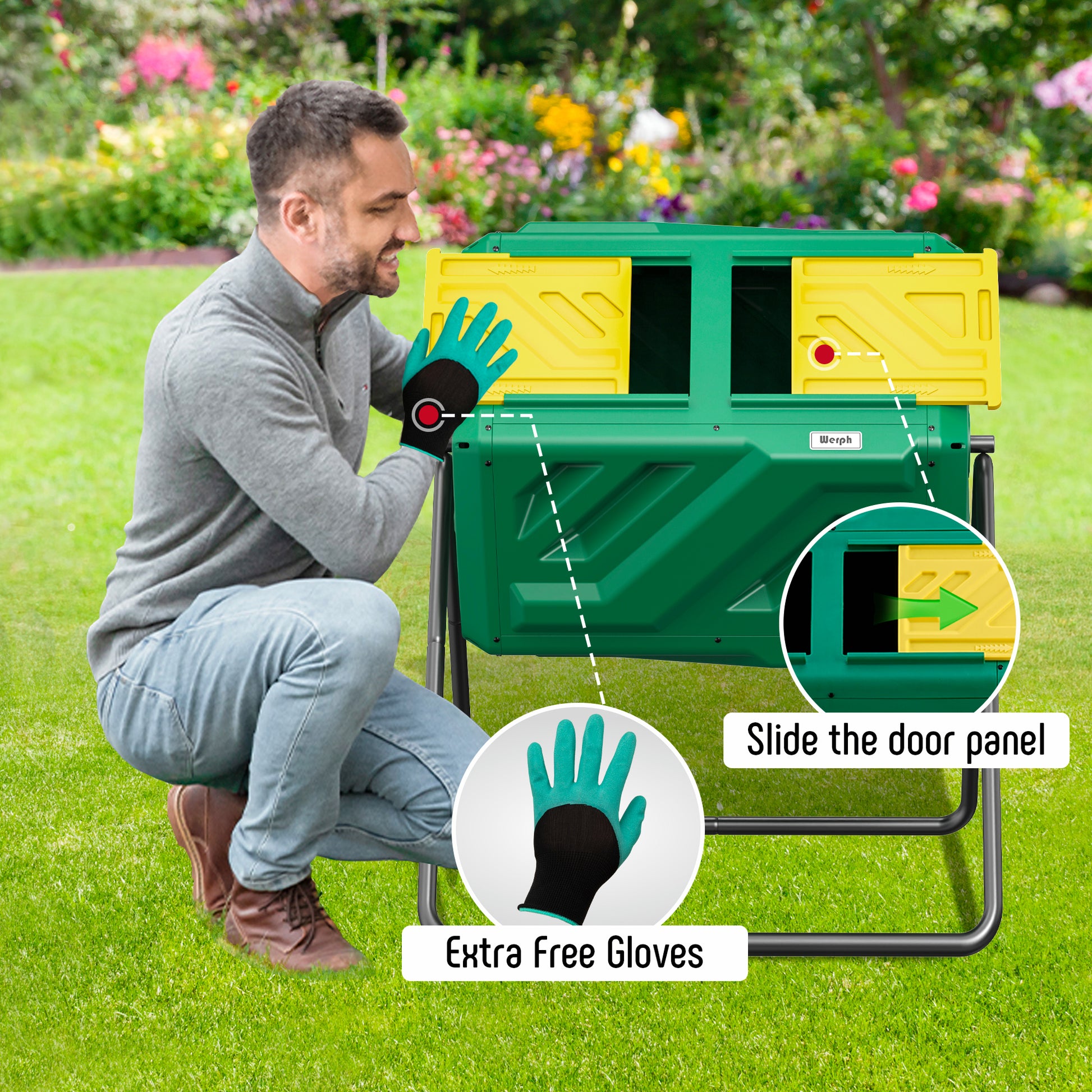 - Convenient Access & Fast Composting: With a sliding door panel for easy access, you can easily add waste. The included gloves help you handle materials, and composting garden waste, kitchen scraps, coffee grounds, and peels takes just 4-6 weeks for nutrient-rich results