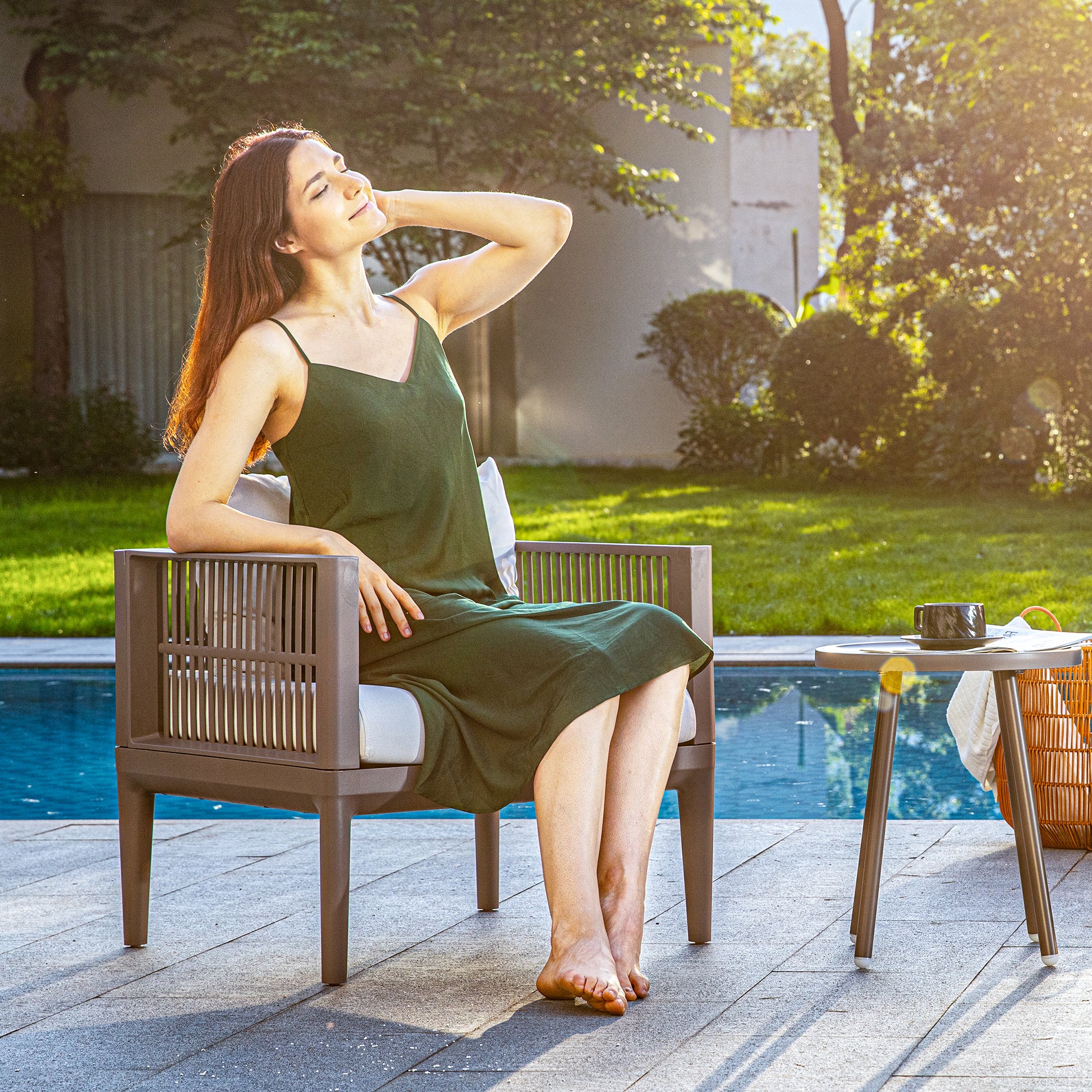 3. Durable and Sturdy: Crafted from UV-resistant, eco-friendly resin, this outdoor furniture set exhibits exceptional water repellency, effectively resisting rust, fading, and rot.