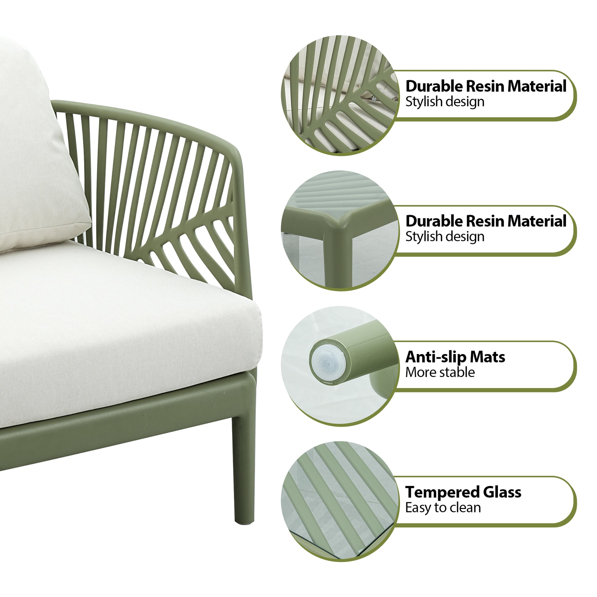 3. Durable and Sturdy: Crafted from UV-resistant, eco-friendly resin, this outdoor furniture set exhibits exceptional water repellency, effectively resisting rust, fading, and rot.